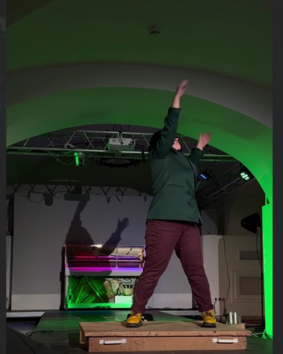 Кому подойдёт? Смелым. Готовым выйти на сцену вместе с перформером и запустить прибор движением тела, стоя на на специальной платформе со встроенной антенной.