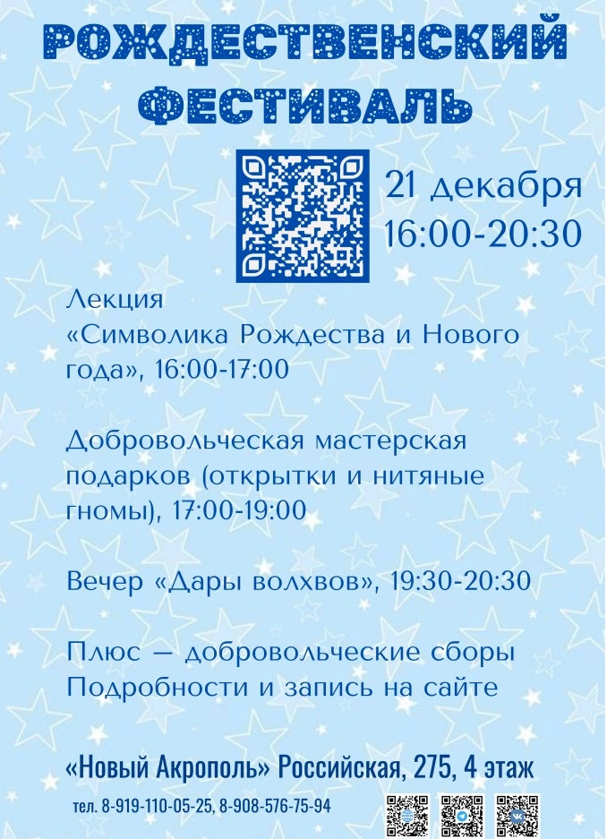 - Вечер «Дары волхвов» (ученики философской школы «Новый Акрополь» поделятся тем, что помогает настроиться на свет и тепло), 19:30-20:30