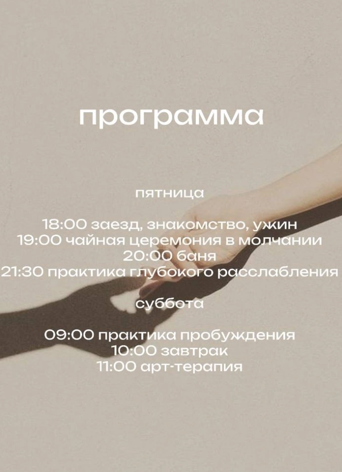 Организаторы рады сообщить, что в уютном загородном доме состоится уникальное событие — женский ретрит! Это будет время для душевных разговоров, самопознания и поддержки друг друга в уютной атмосфере природы.