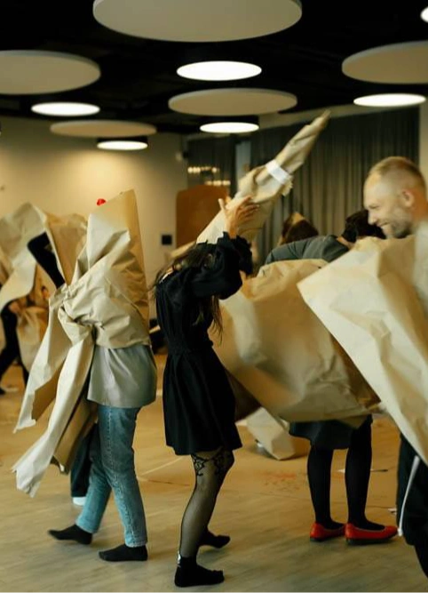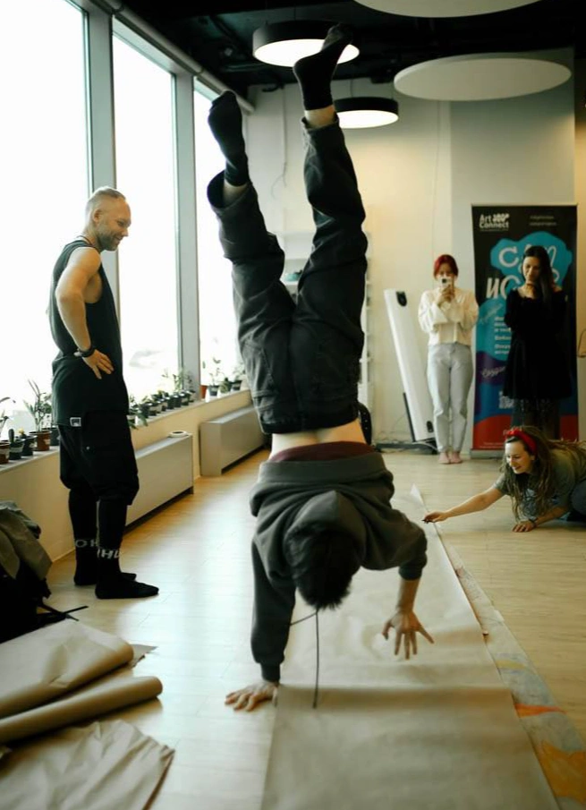 Это будет практика об отношениях с творческими идеями и вдохновением в целом. Исследуешь его при помощи огромных листов крафтовой бумаги, скотча и движения.