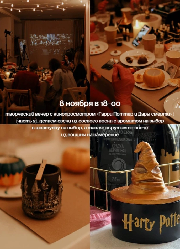 Будешь смотреть последнюю часть и варить чудесные тематические свечи с ароматом на твой выбор. Также ты сможешь выбрать и саму шкатулку для свечи: Хогвартс, шляпа, торт Гарри или тыква. Ещё ты скрутишь по одной волшебной свече на намерение из вощины.