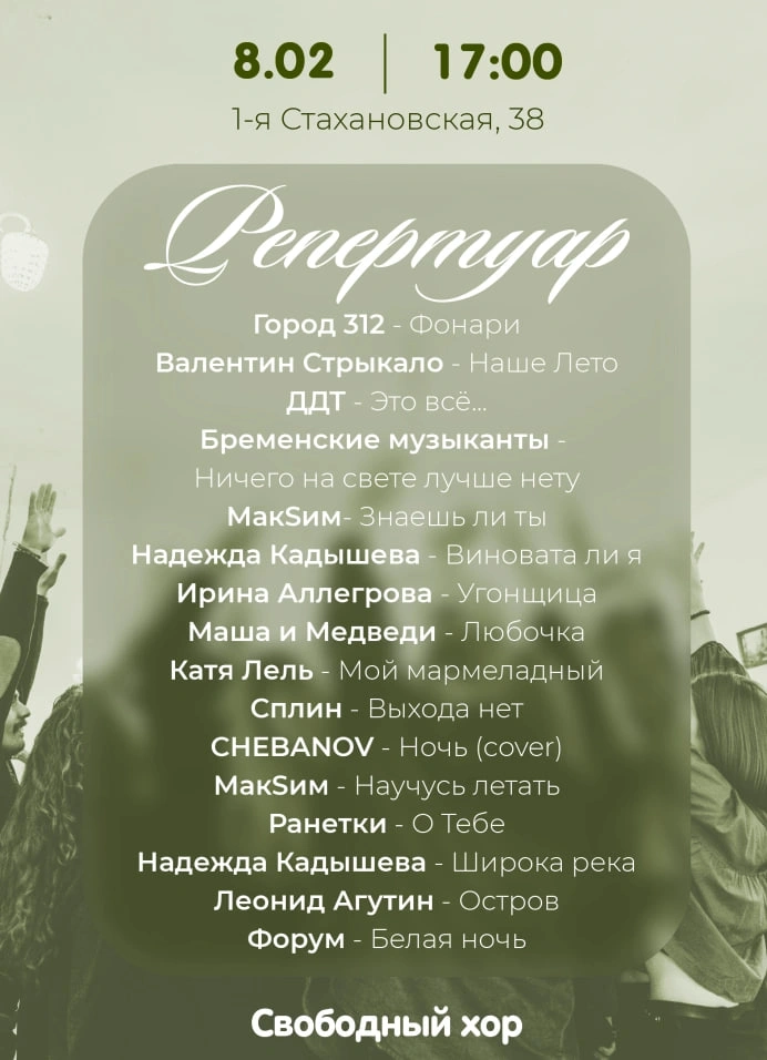 Репертуар: https://vk.ru/music/playlist/419137248_53_cc822bb6a039003030