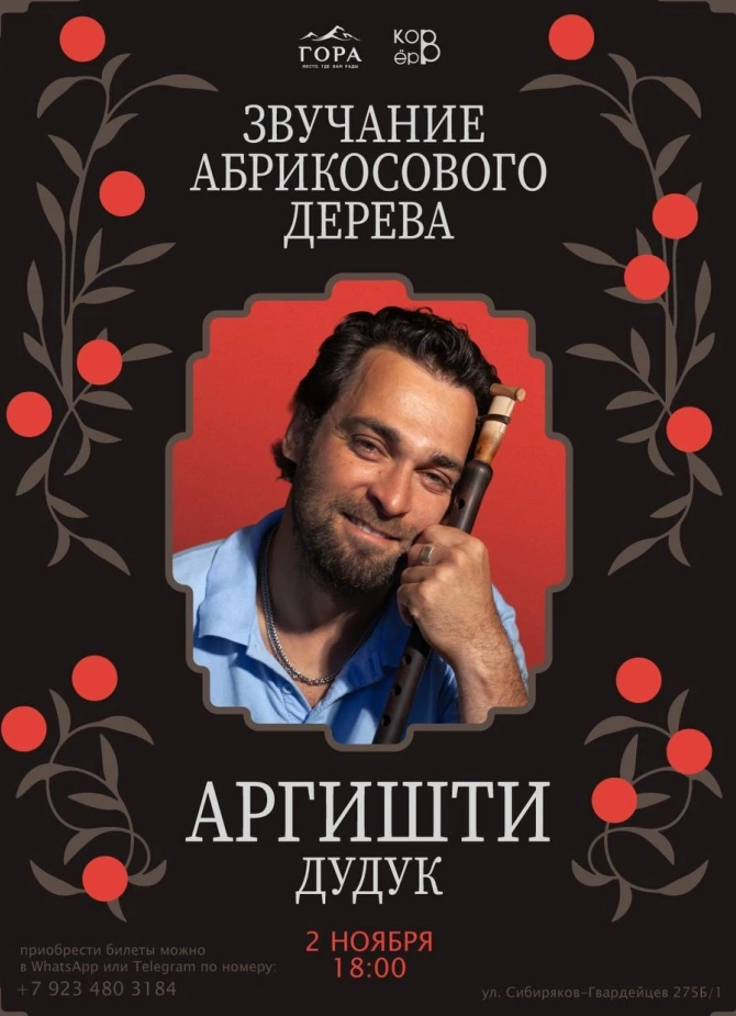 Погрузись в сердце Кавказских гор через магию дудука— древнего армянского инструмента. В этот насыщенный вечер тебя ждёт не только выступление талантливого музыканта Аргишти, но и целая культурная экскурсия.