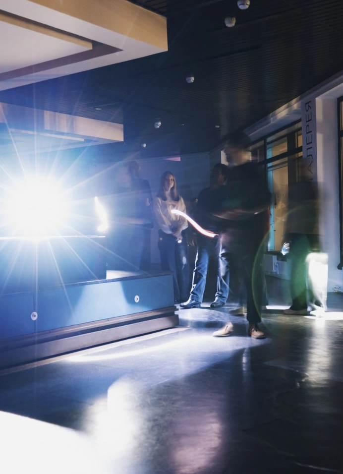 Это путешествие по памятнику советского модернизма в мир современного искусства. Экскурсия каждый раз проходит по уникальному маршруту, в том числе по служебным помещениям.