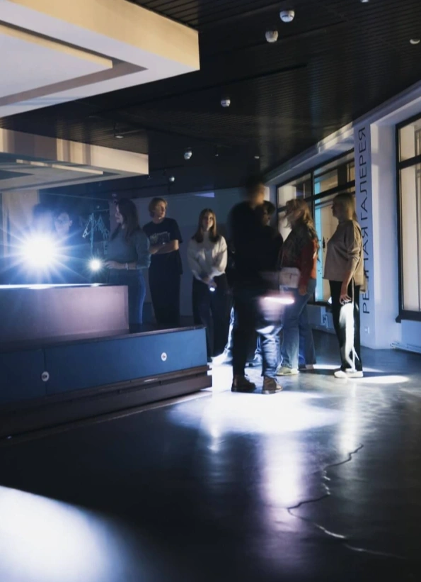 Ночная прогулка сразу по всем выставкам, шанс взглянуть на искусство в непривычном антураже — с фонариком в руке, в окружении темноты.