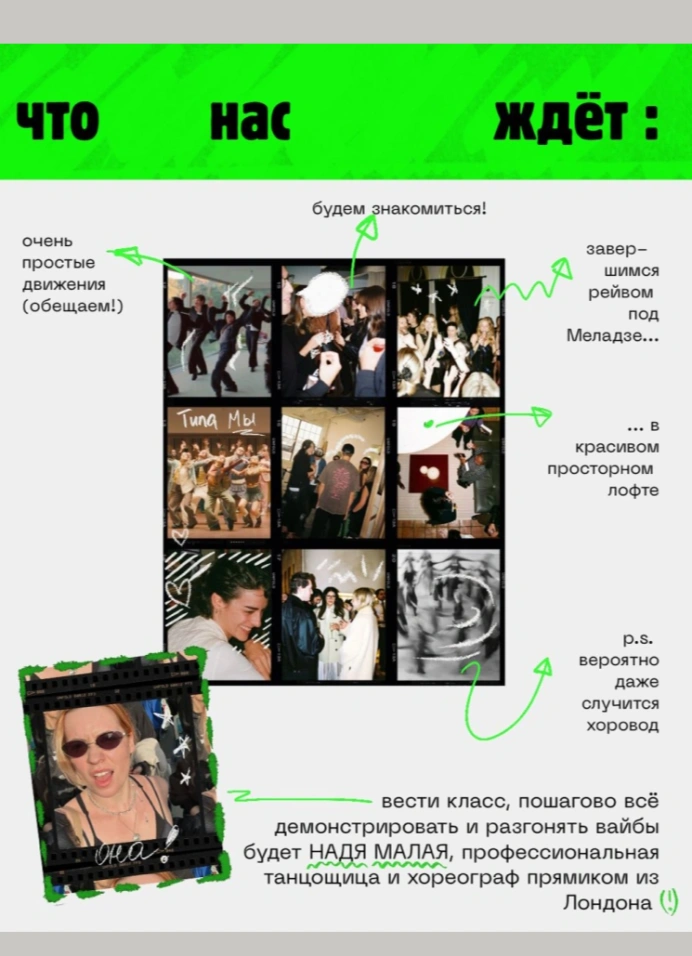 Демонстрировать движения и разгонять *вайбы* будет Надя Малая — профессиональная танцовщица (в Москве танцевала с труппой «ЭТО» Александра Могилёва, в сейчас базируется в Лондоне с сообществом Bambu Bodies), магистр танца лондонского разлива).