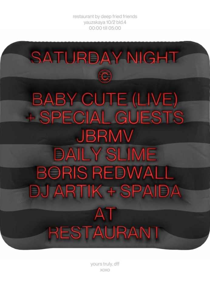 В лайнапе специальные гости с альбома и диджей-сеты от Boris Redwall, Daily Slime, Jbrmv, а также b2b резидентов DFF club Dj Artik и Spaida.