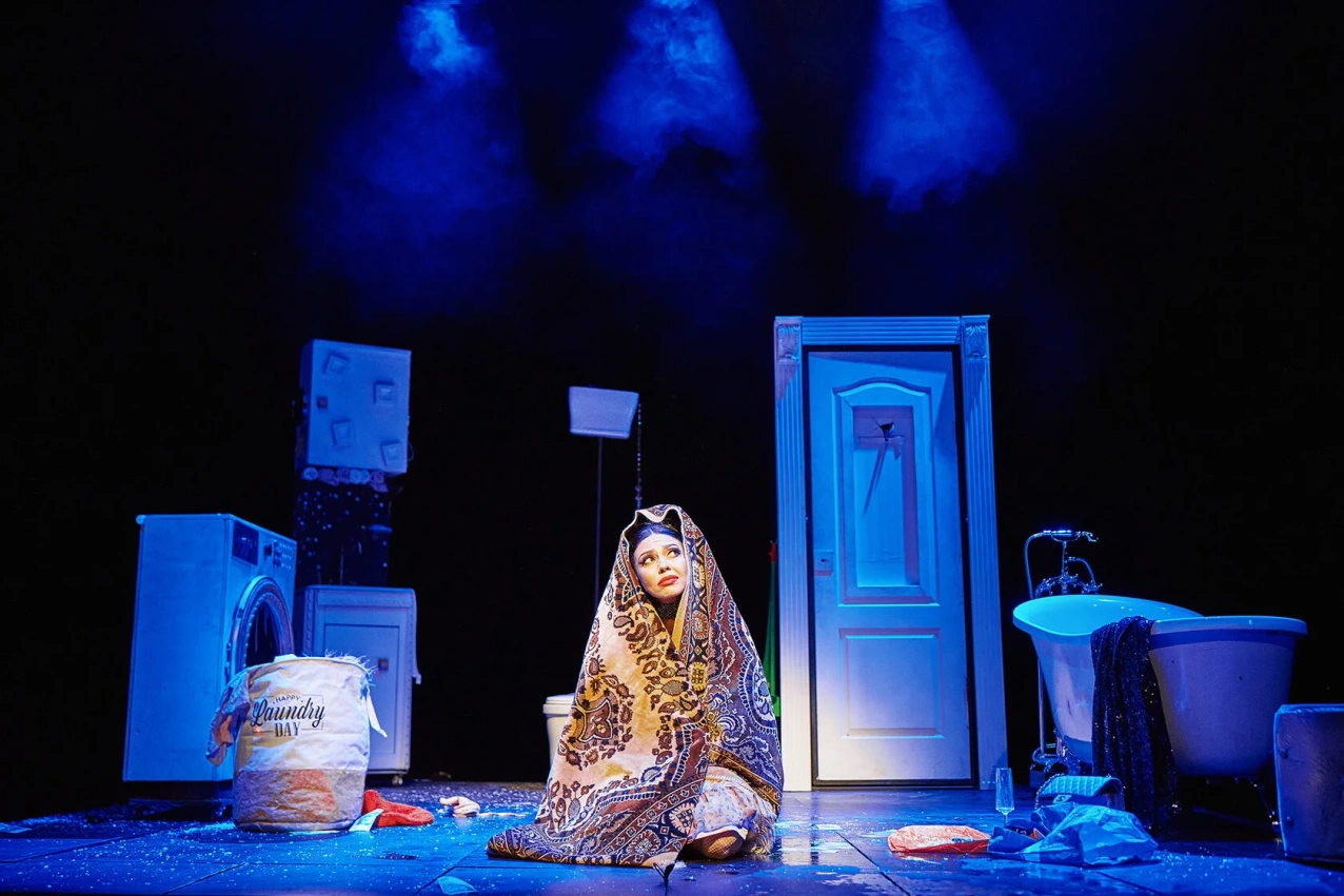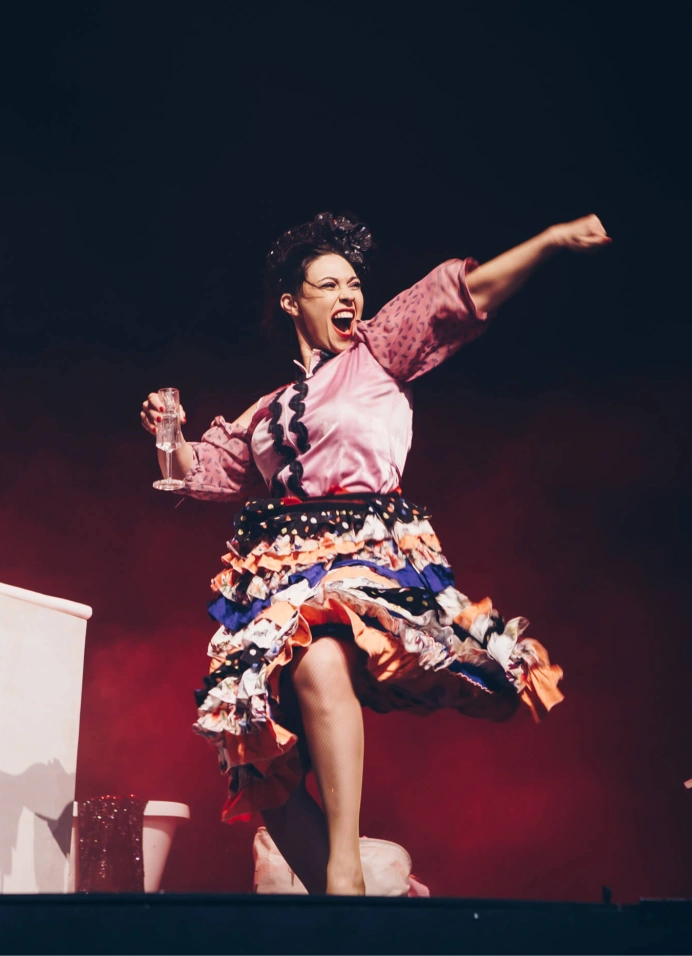 На сцене Анна Музыченко — одна артистка, множество амплуа, трансформирующаяся декорация и музыка группы The Hatters.