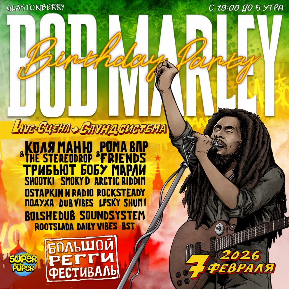 Клуб «Glastonberry» на десять часов станет эпицентром позитивных вибраций. Регги, даб, ска, дэнсхолл, джангл — приготовили для тебя всё самое вкусное. Звезда отечественного раггамаффина Коля Маню выступит с живым бэндом The Stereodrop. Рома ВПР с друзьями-музыкантами покажет, что такое рутс-регги по-русски. Конечно же, специальный сет с песнями Боба Марли от трибьют-бэнда «Слава Бобу!».