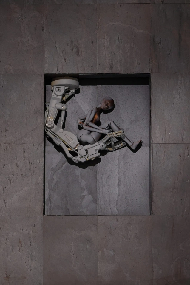 Персональная выставка Алексея Громова — это спекулятивный проект о природе художественного процесса. Он имитирует ретроспективу в вымышленной вселенной, где художником является кукла. Это мысленный эксперимент в жанре институциональной критики: творец и произведение меняются местами, а вопрос «кто автор?» доводится до предела. Кукла выступает автором, а реальность собирается из артефактов и помех — «сломанного языка».