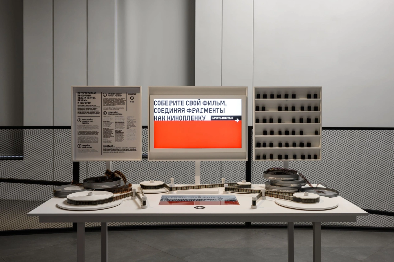Выставка развёрнута в пространстве, напоминающем бобину плёнки, и включает разделы: «Киноправда», «Киноглаз», «Человек с киноаппаратом», «После Вертова» и др. Посетители видят десятки экранов, могут воспользоваться аудиомаршрутом и монтажным столом. В финале предлагается снять ролик на смартфон — лучшие работы войдут в экспозицию.