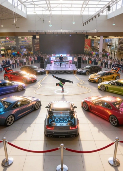 Рядом с фудкортом расположат самые прокачанные автомобили команды производителя автозвука Prology, которые соединили в единую аудиосистему. Они станут огромными колонками на колёсах, через которые будут зажигать музыканты.