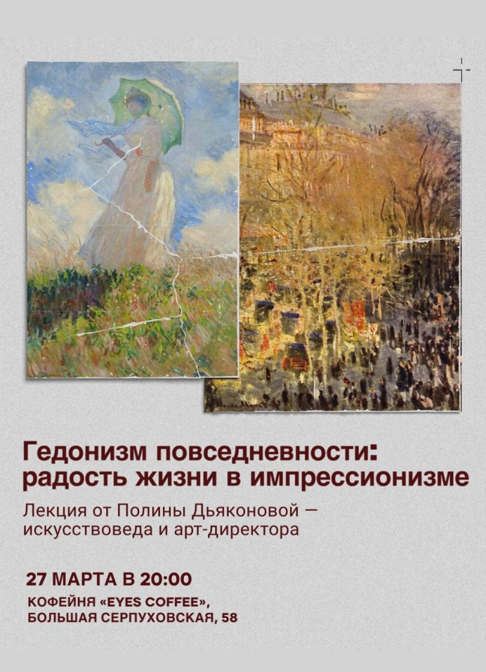 На лекции будешь разбираться, как свет стал главным героем живописи, почему цвет начал «дышать», а мазок — «вибрировать». Как ощущение момента превратилось в эстетическую стратегию? И почему картины Моне, Ренуара и Писсарро до сих пор вызывают чувство лёгкости, будто мир на секунду стал яснее и мягче?