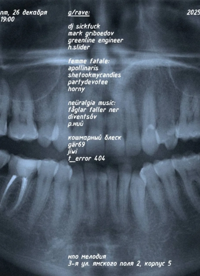 Никаких жанров — только мутации, ну или во всяком случае – такой референс. Каждый из артистов придумал себе несуществующий зубодробительный жанр и заодно название того, что с ним будет происходить во время выступления – юзер-экспириенс 2в1. Получается какое-то коллективное бессознательное… осознающее себя вечеринкой.