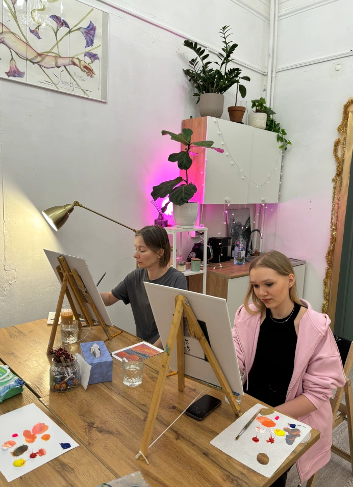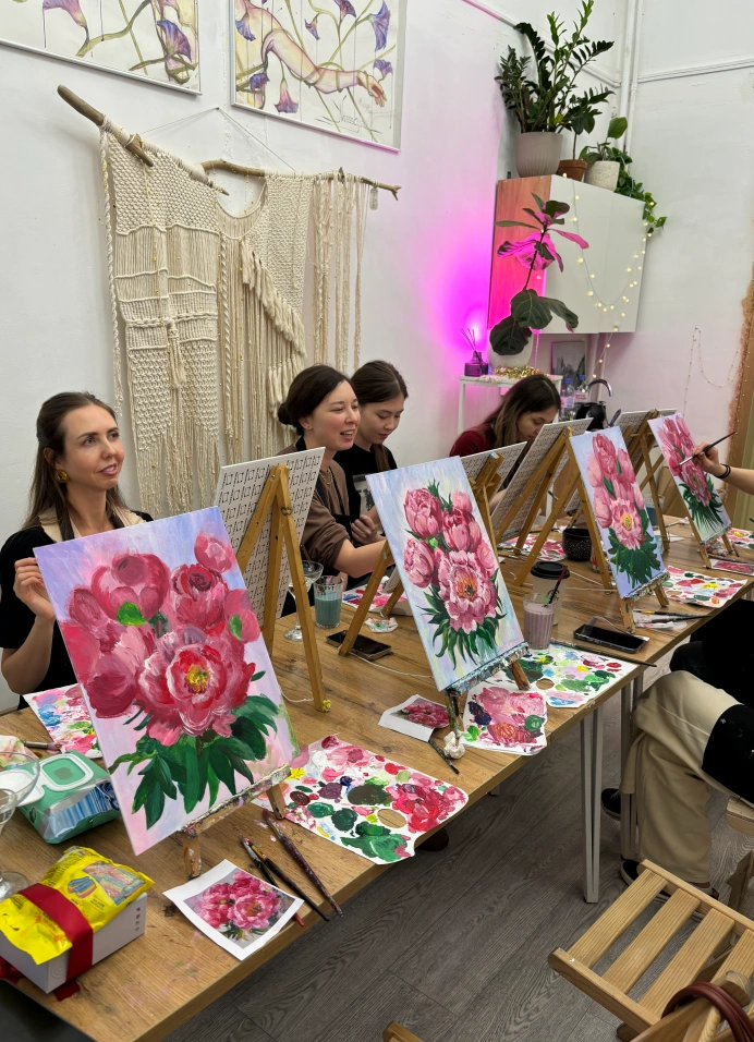 На мастер-классе ты сможешь за одно занятие написать собственную картину. Подходит для людей без опыта рисования, художники помогают в процессе.