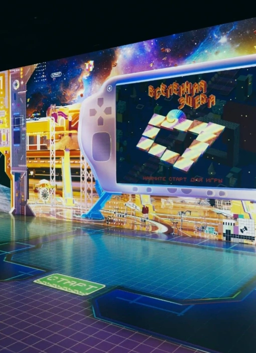 Интерактивное шоу об эволюции видеоигр: от 8-битной графики до современных 3D-миров. Это масштабная среда, где история гейминга оживает на стенах и полу, а гость становится главным героем.