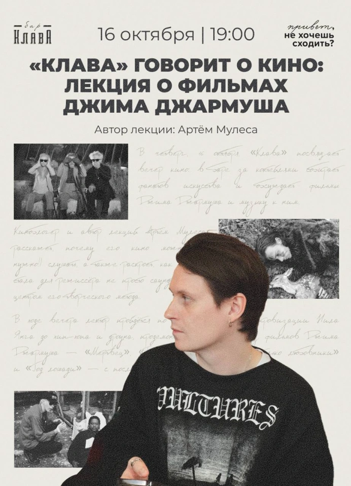 Киноблогер и автор лекции Артём Мулеса расскажет, почему фильмы Джармуша можно (и нужно!) слушать, а также раскроет, как музыка стала для режиссёра не просто саундтреком, а центром его творческого метода.