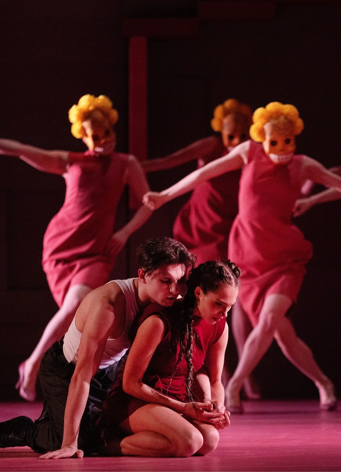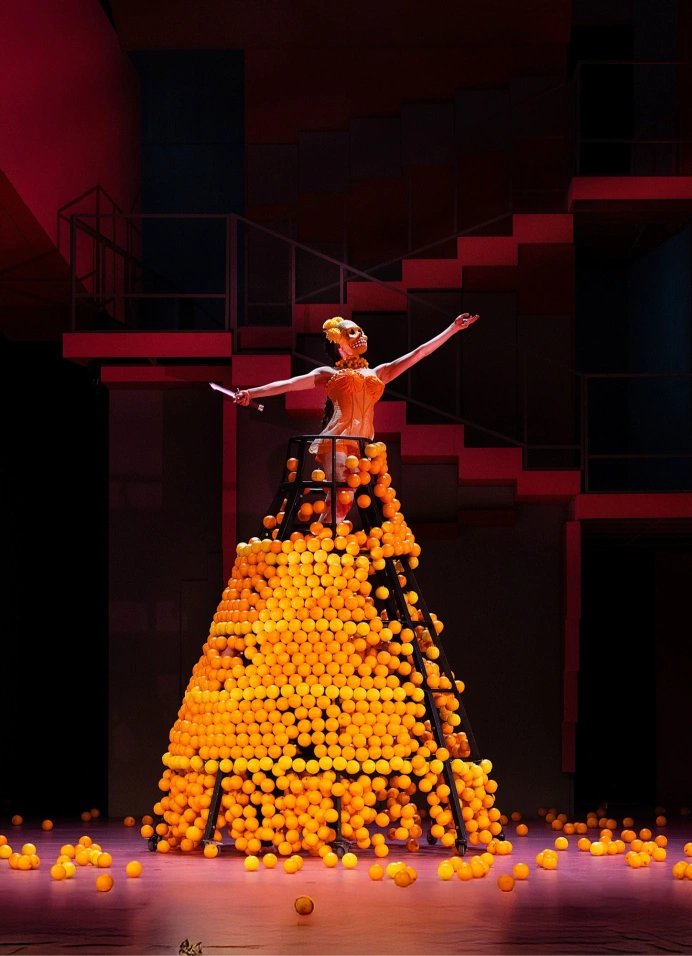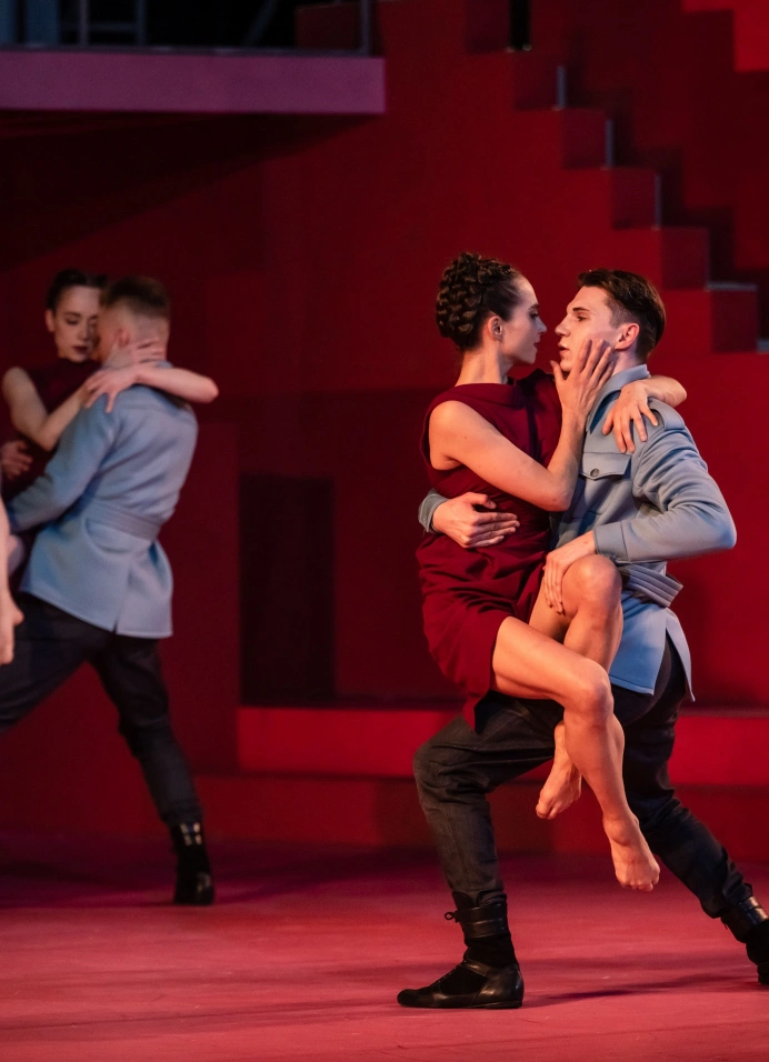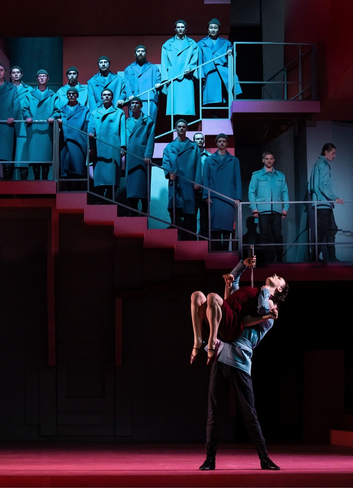Образ спектакля – это тоже пространство внутри головы, которое выстраивается как бесконечная лестница Маурица Эшера, «невозможный объект», ведущий одновременно и вверх, и вниз. Сценограф Лариса Ломакина добавляет красный цвет, как в архитектурных шедеврах каталонца Рикардо Бофилла, чтобы зрительная память сразу откликнулась: Кармен – это, конечно, красное.