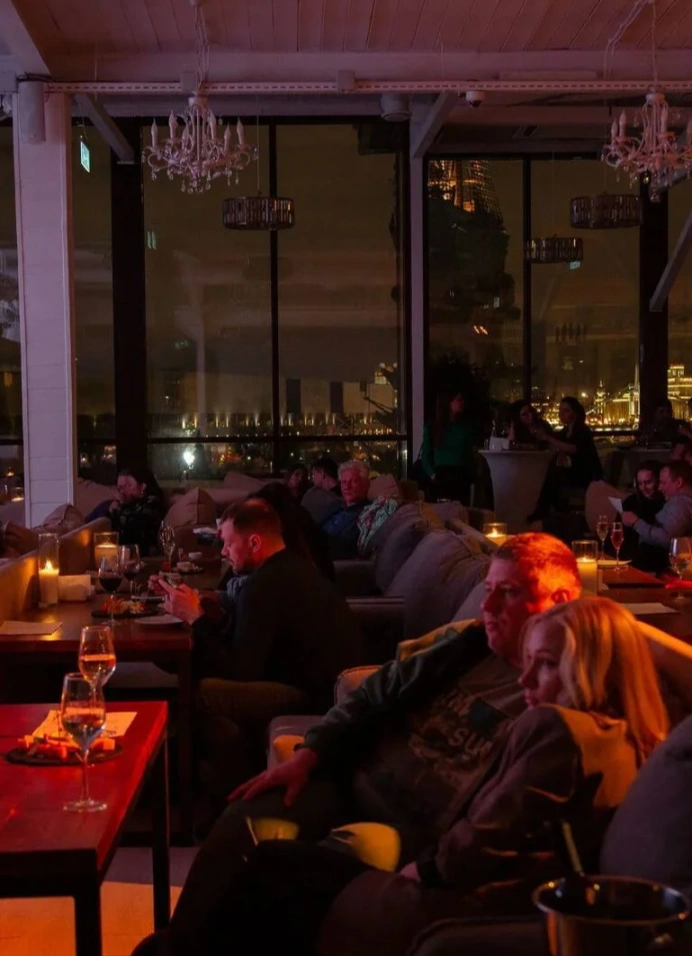 Показ проходит на тёплой панорамной крыше с видом на центр Москвы. Внутри — просторный зал с мягкими диванами, кристальные люстры и много воздуха. А ещё можно выйти на открытую веранду, вдохнуть город и вернуться к экрану.