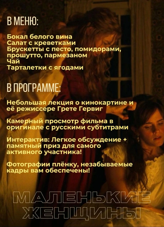 Полноценный ужин, декор, разбор фильма, просмотр в оригинале с субтитрами, интерактив с призом, плёночные фотографии и антураж в усадьбе 18 века в центре Москвы.