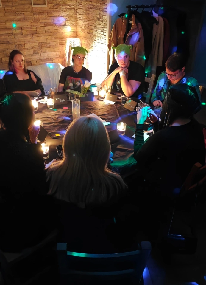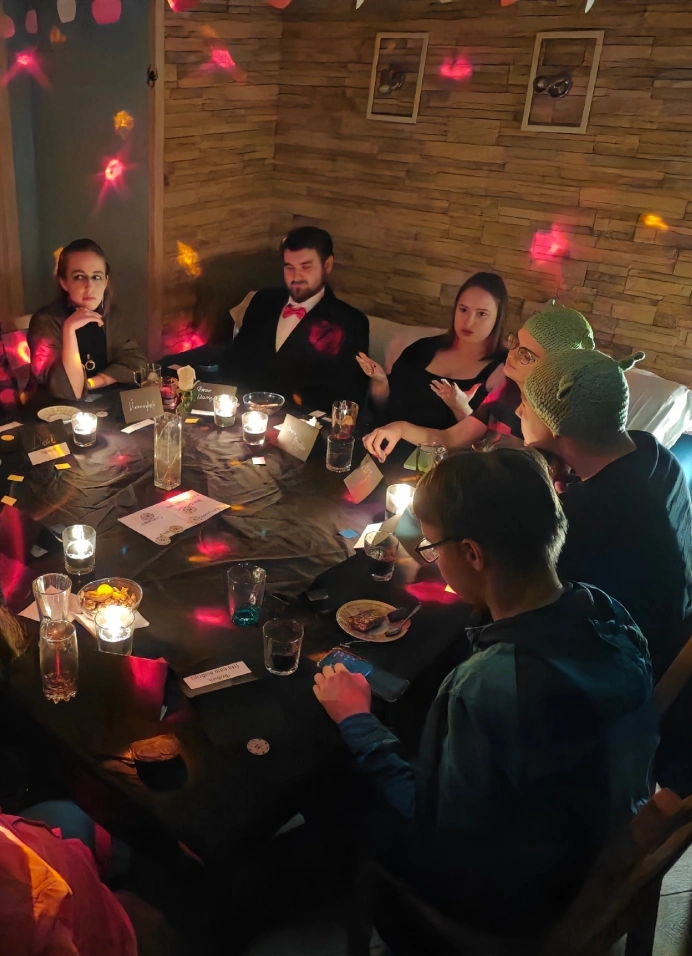 Антуражный стол, свето-звуковые эффекты, звуки выстрелов, огонь, кровь и вино... и очень загадочный ведущий.
