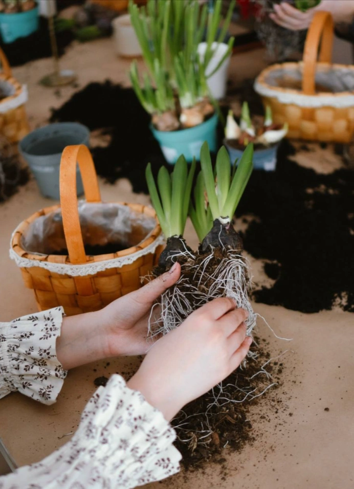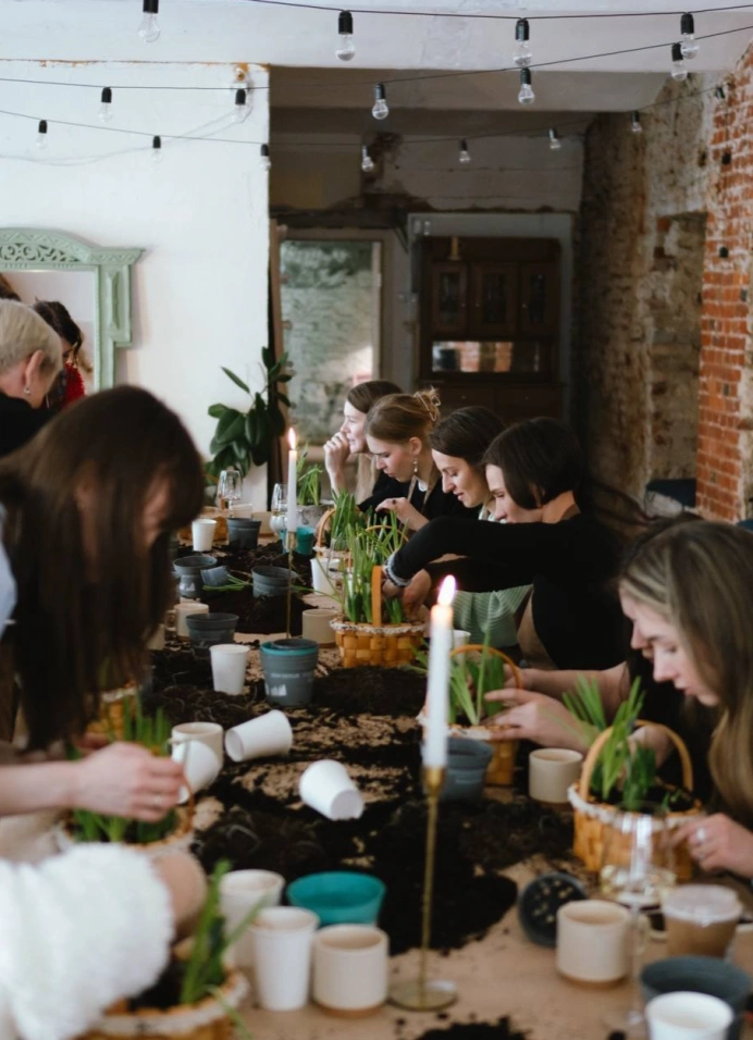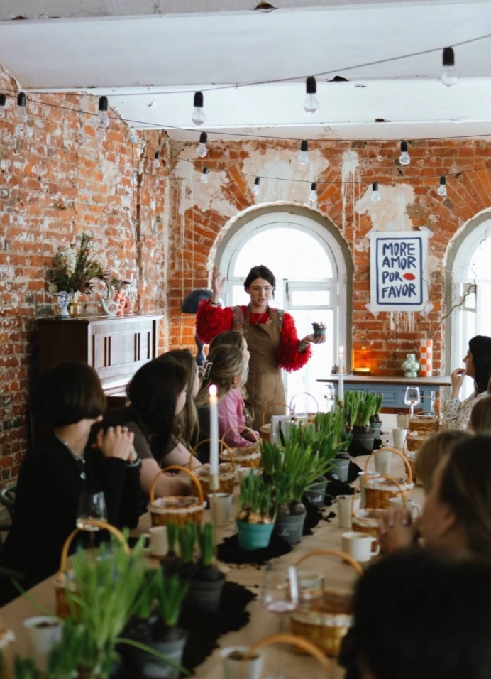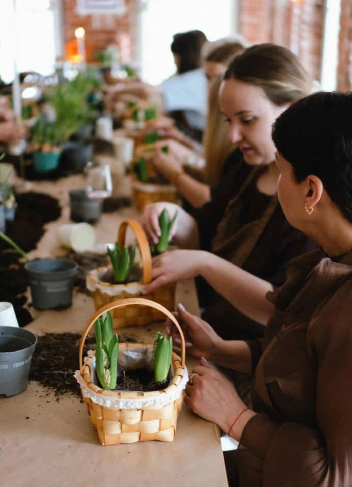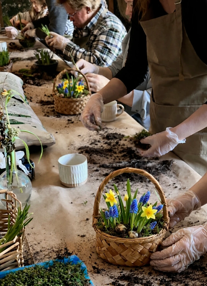 На мастер-классе ты соберёшь композицию с настоящими луковицами нарцисса и мускари, мхом и текстурами. Разберёшься, как красиво посадить растения, как сочетать высоты и как сделать так, чтобы корзинка выглядела аккуратно и при этом естественно.