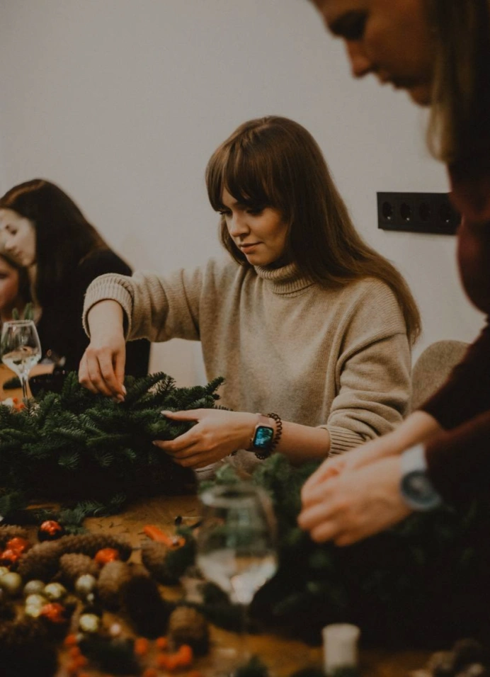 Веночек можно украсить лентой или игрушками по желанию. Всех участников будут угощать игристым вином от винодельни Chateau le Grand Vostock — пусть творчество будет по-настоящему праздничным:)