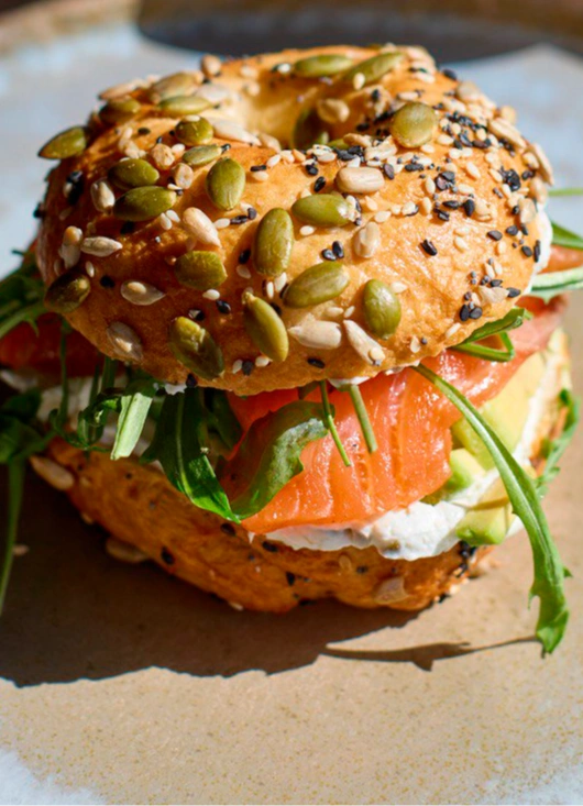 – свежеиспеченный бейгл со слабосоленым лососем;