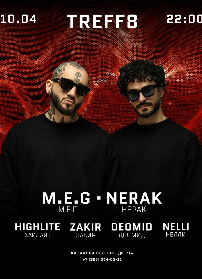 Ведущие артисты вечера — M.E.G & Nerak. Дуэт, чьи релизы выходят на Axtone и Armada, а треки звучат в сетах David Guetta и Swedish House Mafia, включая их узнаваемый хит Все (Everybody). Сегодня их фокус — актуальное звучание и постоянная студийная работа, формирующая их живые сеты.