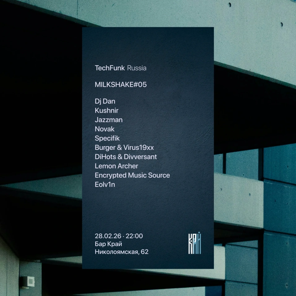 Команда TechFunk Russia вновь собирает любителей ломанных ритмов в стенах уютного бара Край на двух танцполах, чтобы окунуться в мир тек-фанка — жирные басовые линии, приправленные техновыми звуками, и всё это пропитано атмосферой прогрессив-хаус танцполов.