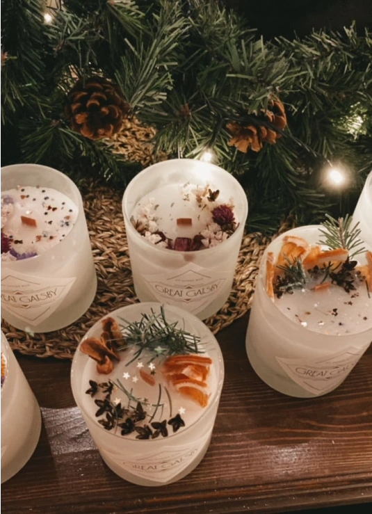 Ты сваришь и украсишь одну свечу в стильной баночке с логотипом «Great Gatsby», используя цветы, специи, блестки, серебряная и золотая поталь, натуральный камень или жемчуг.