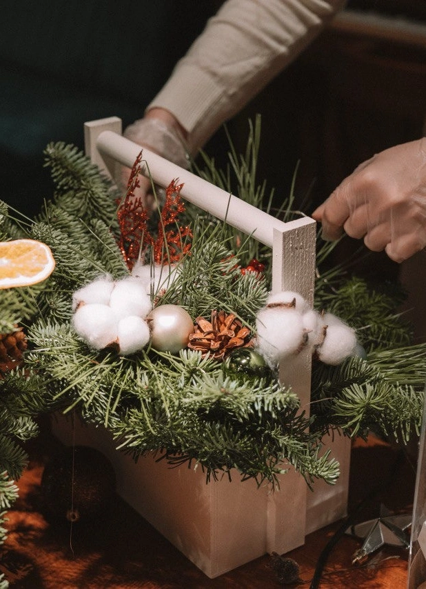 Мастер-класс, на котором ты сможешь собирать композицию в деревянной основе из веточек нобилиса, новогодних игрушек, ароматных шишек, корицы и других природных материалов, которые откликаются твоей эстетике.