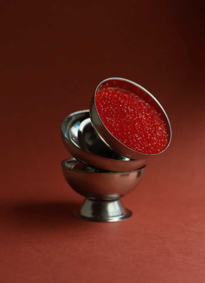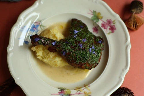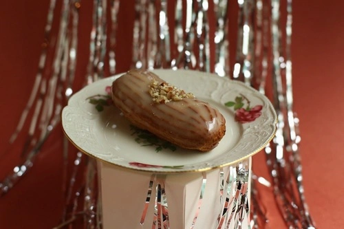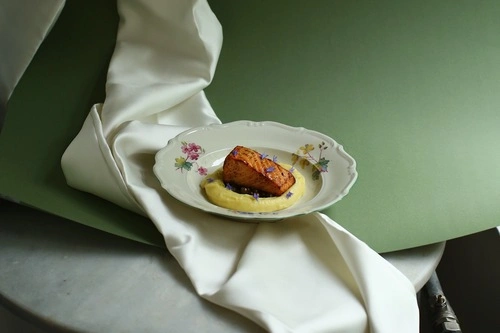 сливочная намазка с красной икрой, тартин, бриошь, эклер, паштет из курицы с красным вином, оливье, горячее на выбор: утиная ножка конфи, соус жю, толчёный картофель / лосось мисо, зелёный горошек, картофельное пюре.