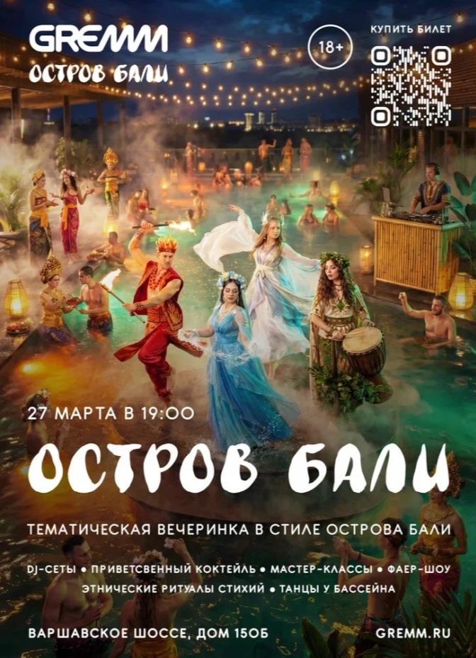 В программе: диджей выступления на двух этажах, приветственный коктейль у бассейнов, создание личного балийского аромата, какао-церемония, саунд-хилинг и медитация на воде, тропические парения с розыгрышем призов и огненное шоу у бассейна на крыше.