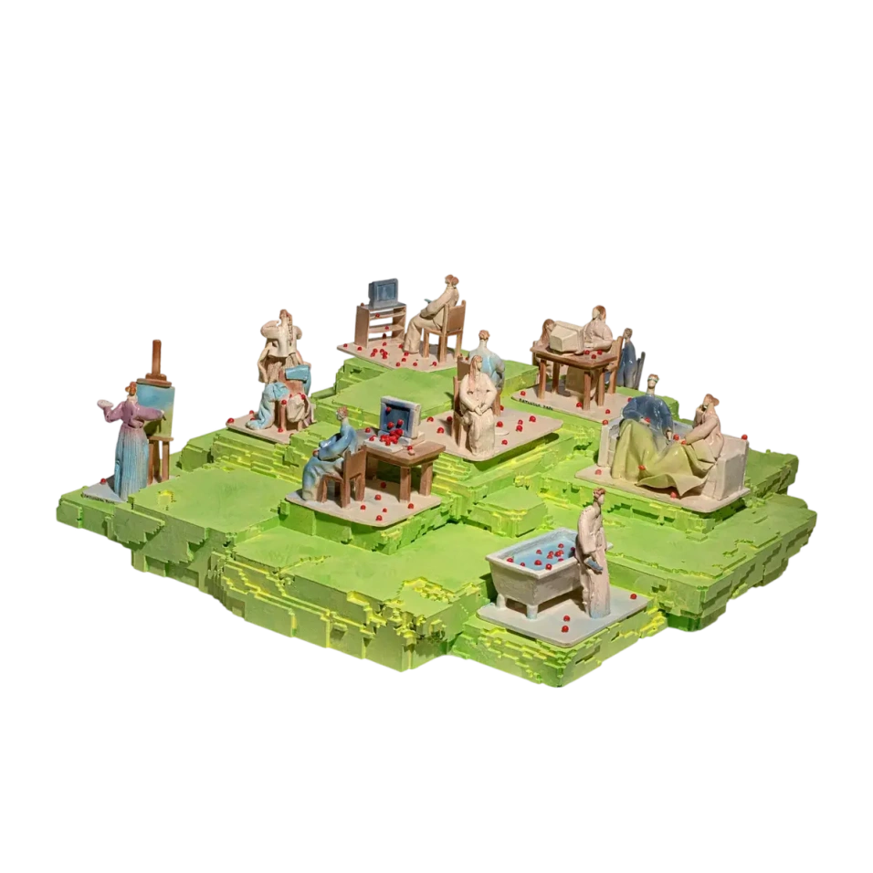 В современном мире границы между реальностью и цифровой средой стираются. Выставка «Перейти на следующий уровень» исследует нарративы компьютерных игр в контексте жизни. Керамика Веры Латышевой анализирует механизмы симуляции: контроль над хаосом, конструирование связей и личных миров.