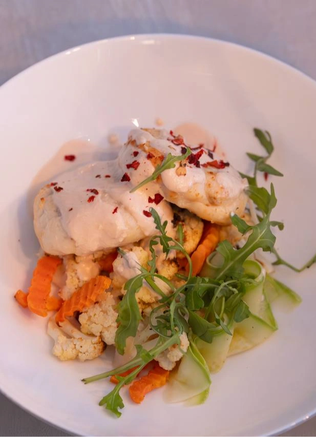 – Запеченное филе утки с яблоками или судак под соусом из грецких орехов с овощами