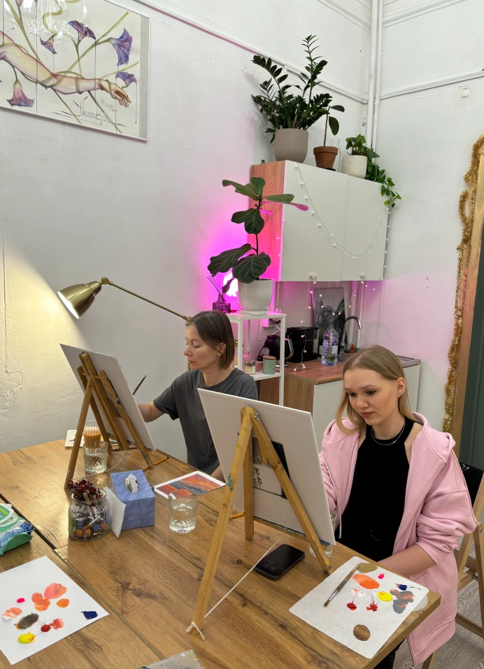 На мастер-классе ты сможешь за одно занятие написать собственную картину. Подходит для людей без опыта рисования, художники помогают в процессе.