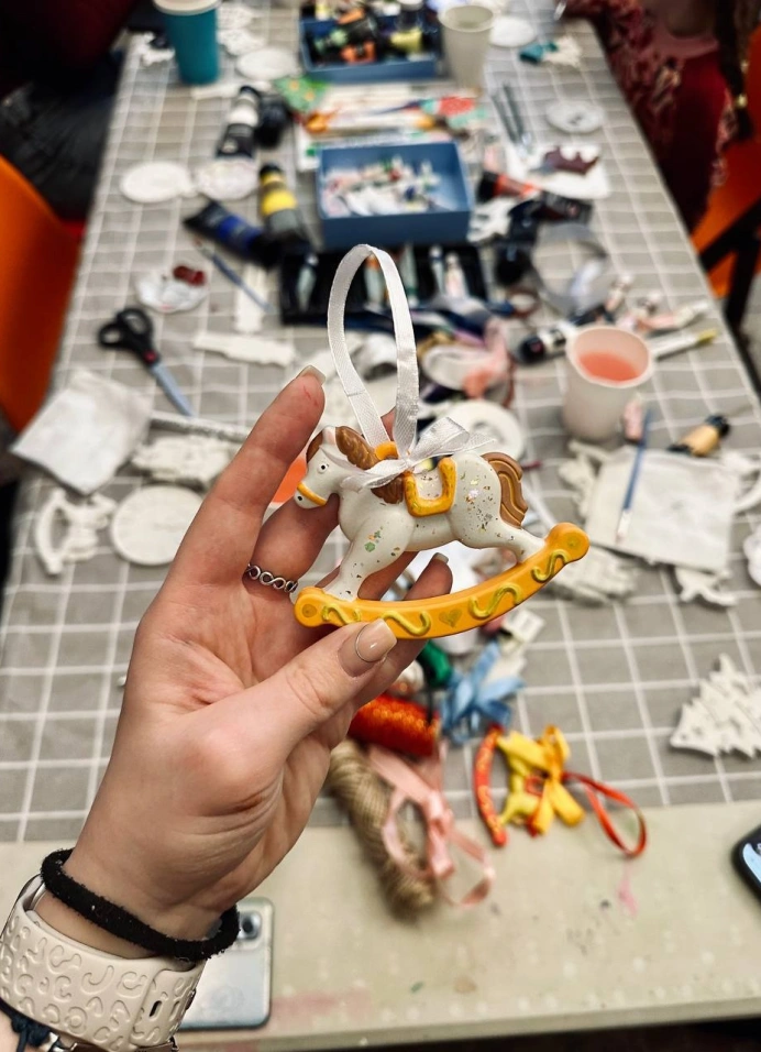 Материалы включены в стоимость (если ты хочешь расписать больше трёх игрушек, за дополнительные игрушки нужно будет доплатить 200 рублей). В наличии будут: лошадки, часы, олени, щелкунчики, ёлочки, новогодние носки и домики.