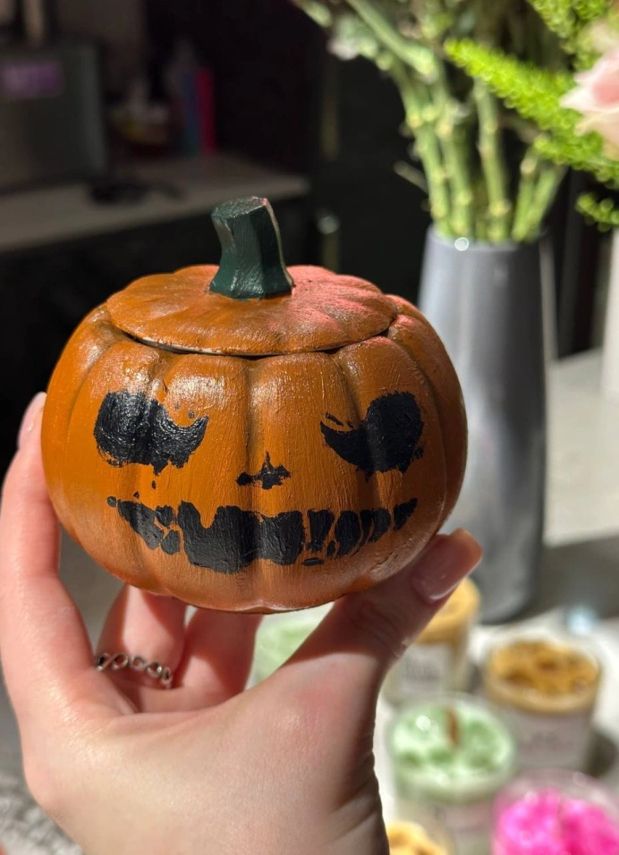 Мастер-класс по росписи гипсовых подсвечников в форме тыкв, угощение напитками и просмотр «Каролина в стране кошмаров» на проекторе в баре.