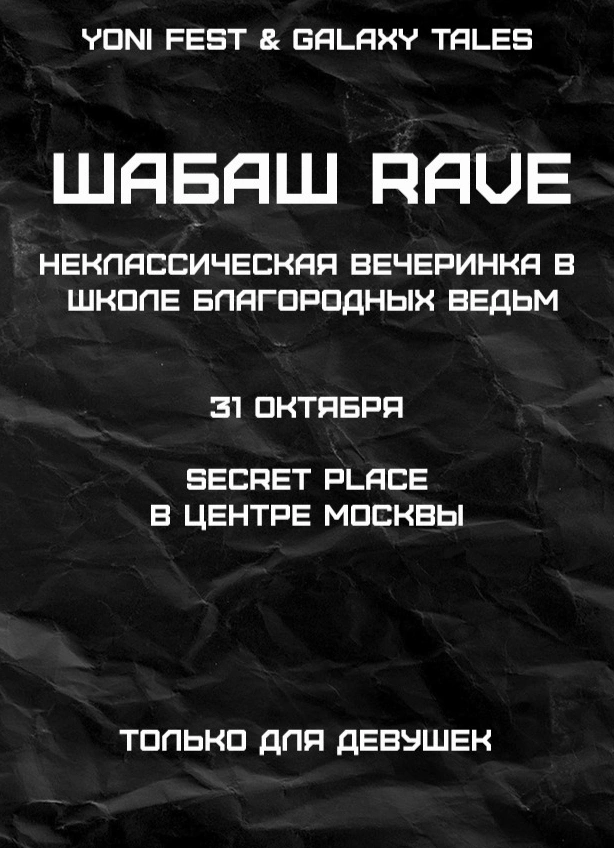 Самые сильные ведьмы страны соберутся на ШАБАШ RAVE от Yoni Fest & Galaxy Tales. Присоединяйся к НЕклассической вечеринке в школе благородных ведьм! Раскрой свои сверхспособности в танце. Только для девушек.