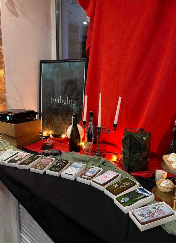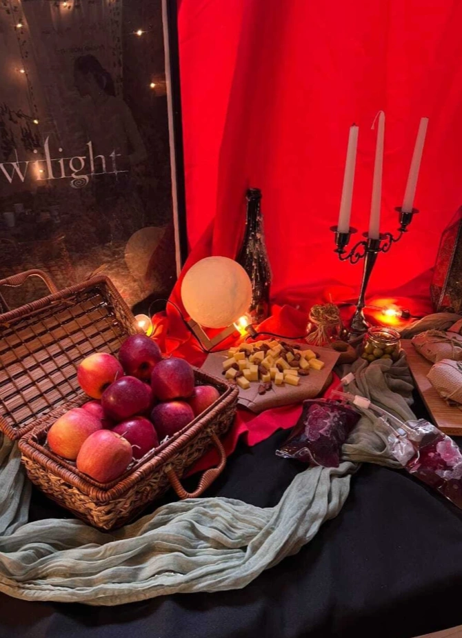 Здесь создадут волшебное пространство, наполненное таинственными элементами, которые перенесут тебя в мир вампиров и романтики, а также подготовят тематический фуршет.