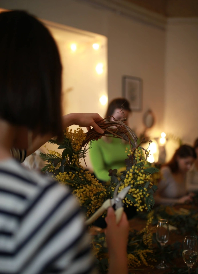Уйдёшь домой с венком, который захочется повесить сразу — на дверь, у зеркала, над кроватью. Пусть весна войдёт в дом первой.