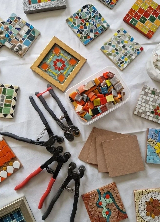 Мягкий свет лампы выхватывает из полумрака россыпь смальты. Ты берёшь тёмно-синий кусочек — гладкий, с шершавыми краями, похожий на осколок ночного неба. Рядом: изумрудный, жёлтый, алый.