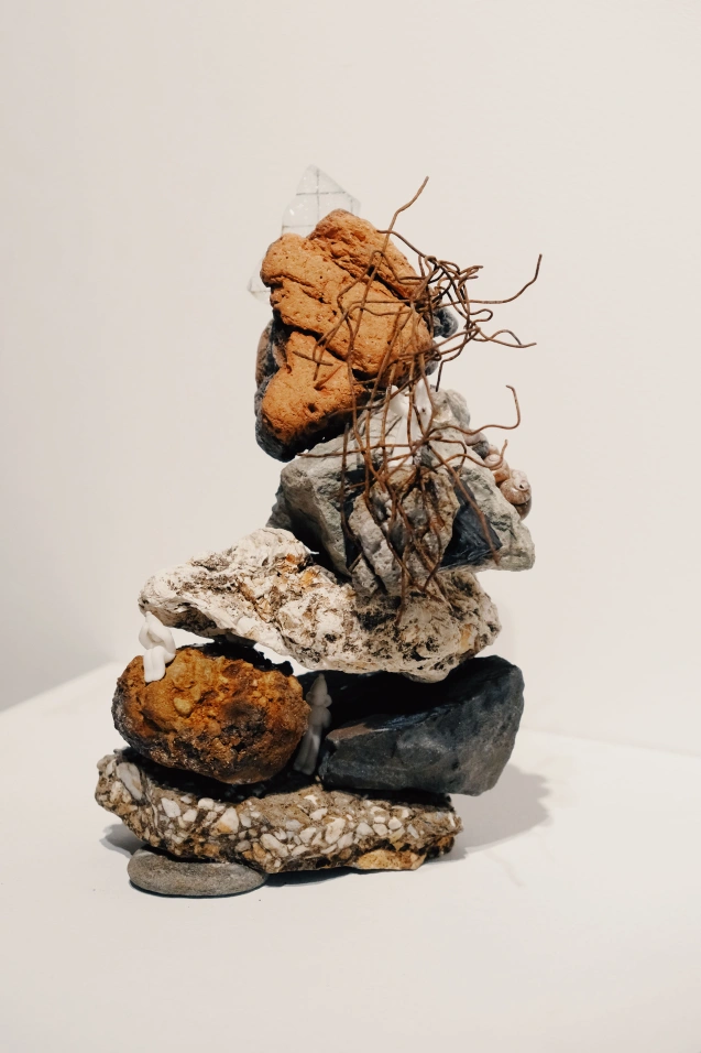 Герда Ваас (участница арт-группы PARZAIT): объекты из найденных материалов (камни, кости) — серия «Обелиски» о собирании человека из частей.