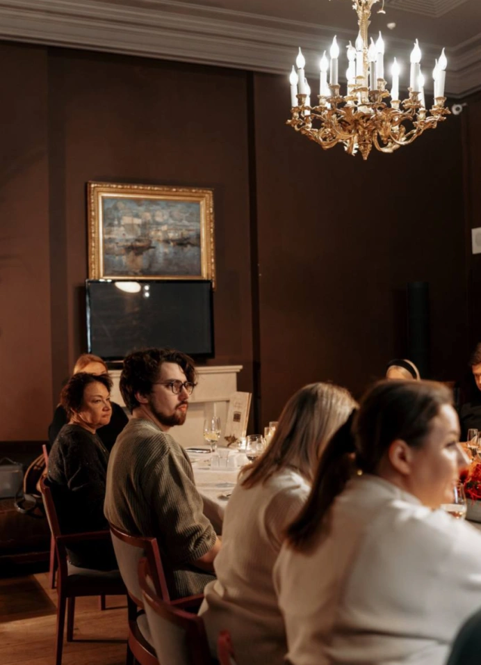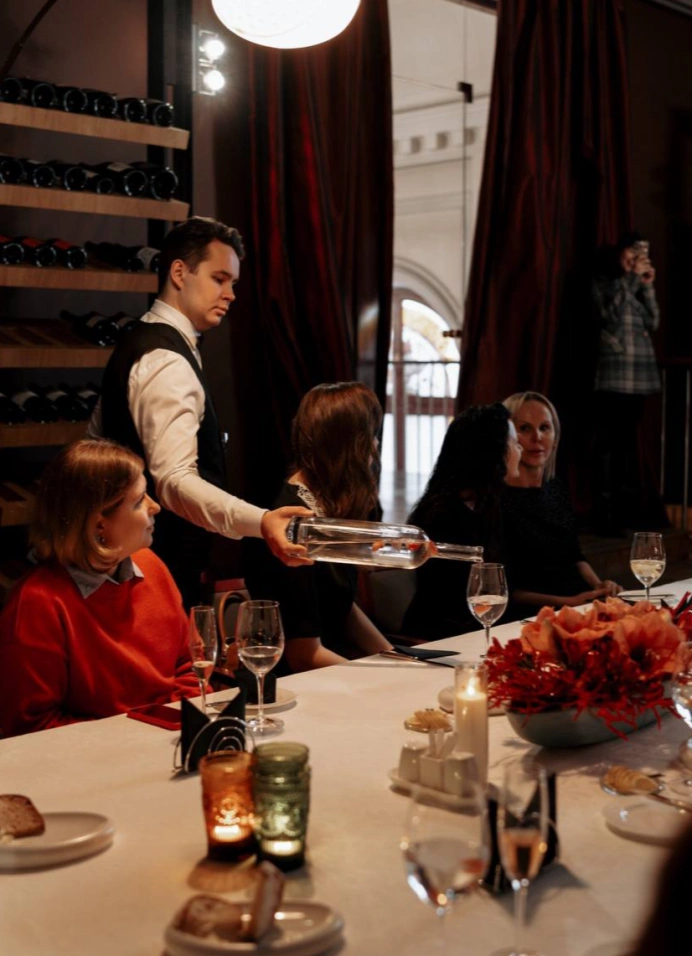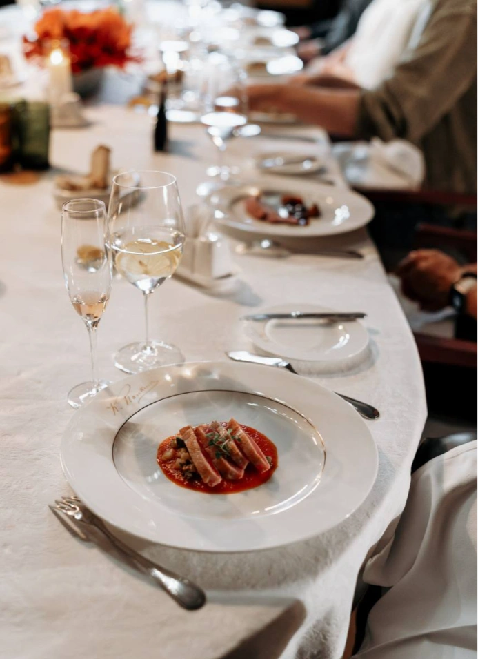 – Свежие листья салата с тунцом, сырники с морошковым вареньем, копчёное масло и два вида хлеба, освежающая вода с клубникой, чай или кофе на выбор, розовое игристое Cremant de Loire.