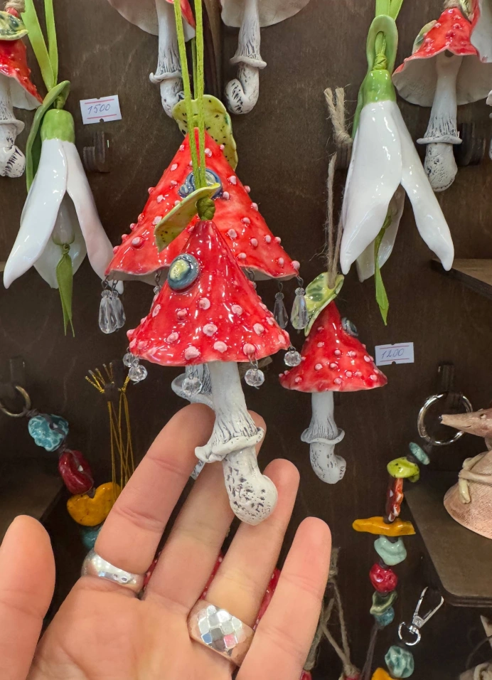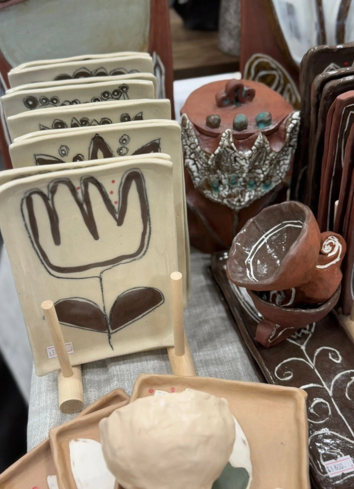 — Вещи для дома. Светильники из дерева; керамические салатники с росписью, кружки с отпечатками настоящих растений, деревянные доски, часы и шкатулки, игрушки ручной работы и многое другое.