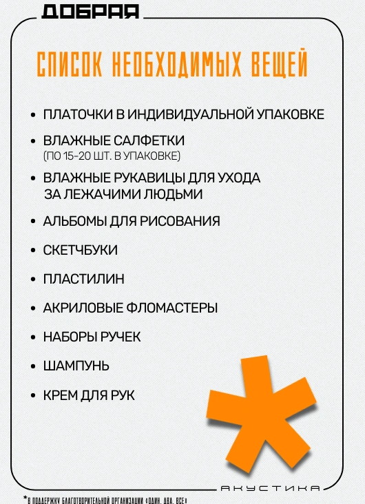 Зрители смогут сделать доброе дело и принести необходимые вещи для благотворительной организации «Один, два, все».