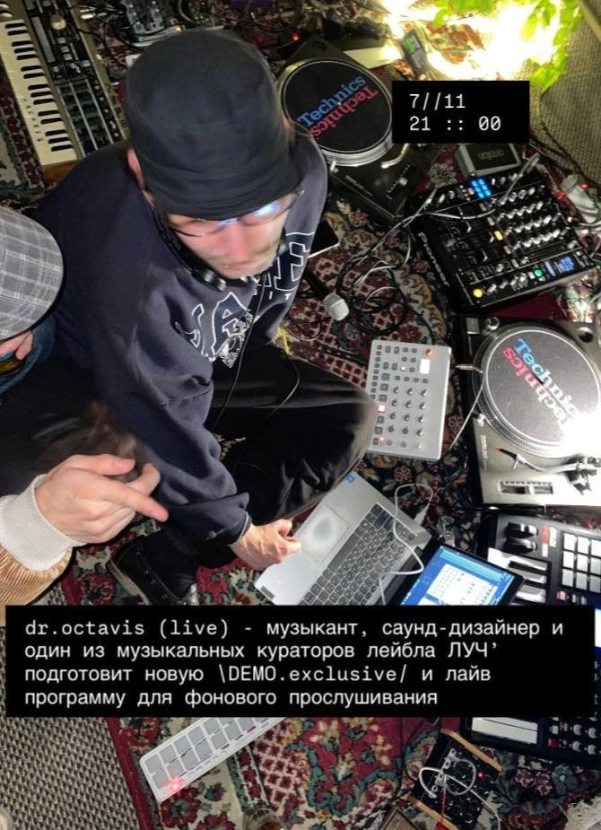 Музыкант, саунд-дизайнер и один из музыкальных кураторов лейбла Луч подготовит новую \Demo. exclusive/ и лайв программу для фонового прослушивания.
