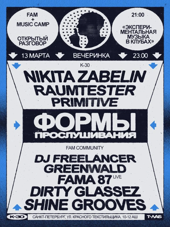 Т-Лаб: презентация релиза Listening Forms от FAM, который увидит свет именно в эту дату. От спокойных форм в начале ночи, до клубных в прайм-тайм. Специальный гость: уральский продюсер — Shine Grooves.