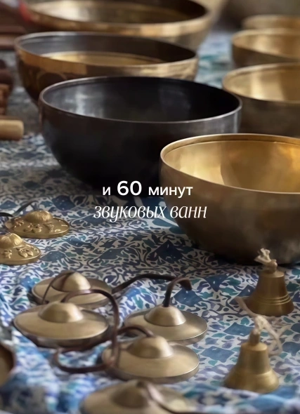 В продолжение практики тебя ждёт 60 минут медитации под звуки поющих чаш, колокольчиков и других редких инструментов.
